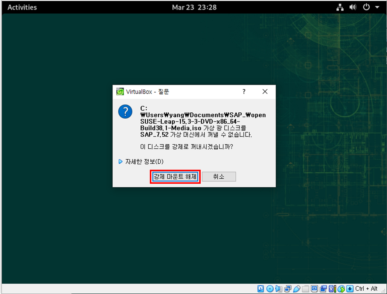 마지막으로 OS설치에 사용한 OpenSuse 15.3 가상드라이브를 꺼내주세요.